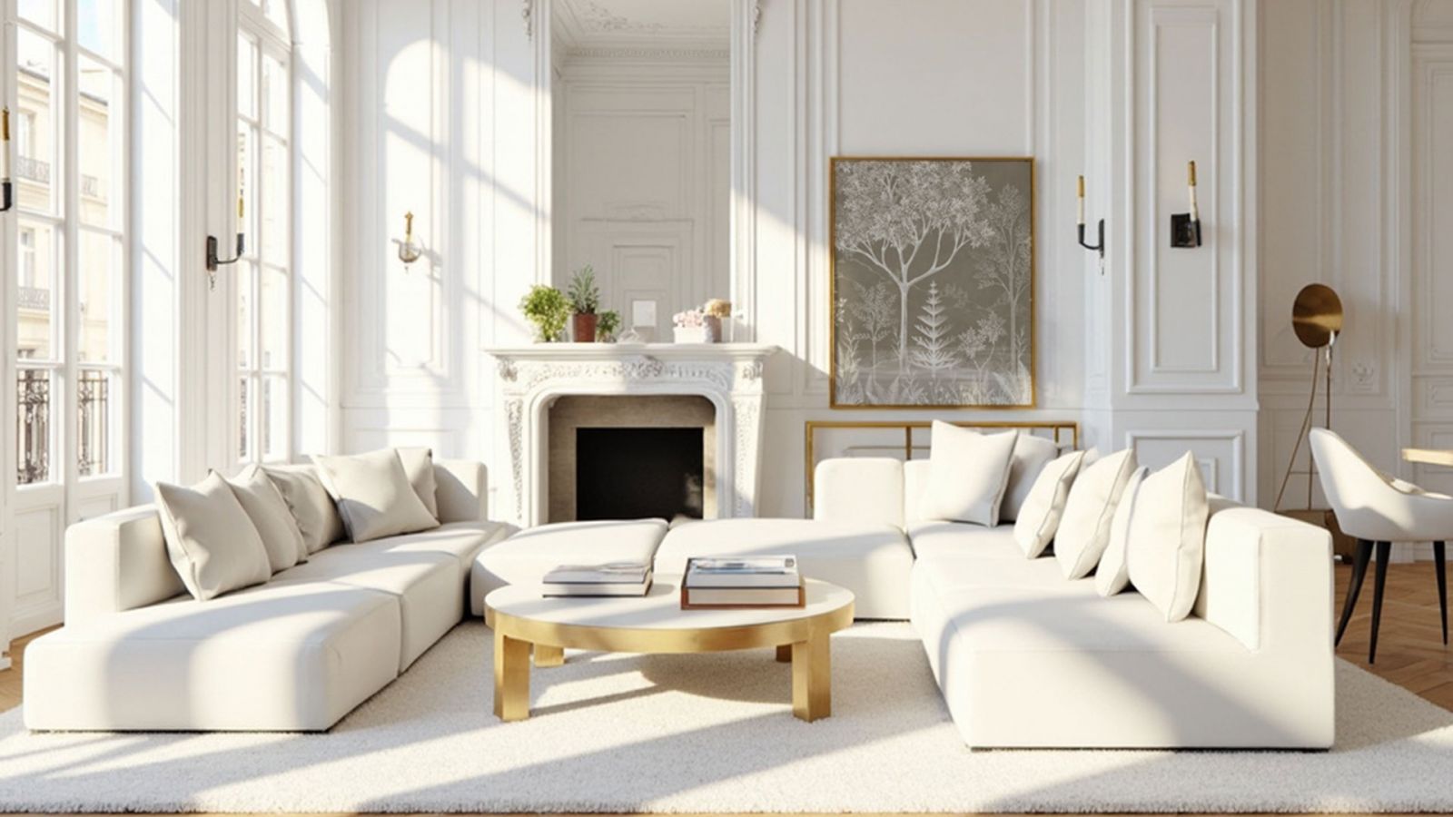 Главным выступает белый цвет и его оттенки – молочный, слоновая кость, бежевый и т.д. Такая цветовая палитра наполнит даже малометражную комнату воздухом и светом. Чтобы монотонные стены и потолок не выглядели скучными, их украшают лепниной, молдингами, плинтусами, розетками с узором и другими объёмными элементами. Разбавить белую цветовую гамму помогут лавандовые, песочные, охристые, розовые, голубые тона. Очень важно помнить, что французский стиль любит сдержанную роскошь, но без золотых линий здесь не обойтись. В таком интерьере вы обязательно увидите золотые «солнечные» акценты. Также в качестве акцента можно использовать и более насыщенные, тёмные цвета – бордовый, синий, терракотовый, зелёный.