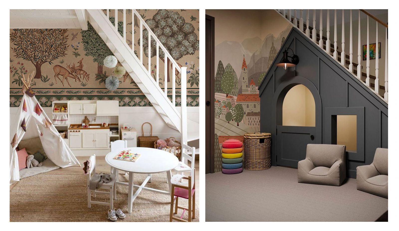 Если места под лестницей достаточно, можно сделать там тайную комнату для детей. Здесь ребята смогут строить секретные штабы, прятаться и заниматься своими мегасерьёзными делами. Оформите пространство обоями с детскими рисунками и тематической мебелью, чтобы было уютно. Для подростков можно создать антикафе с игровой приставкой и удобными креслами-мешками. Они точно оценят!