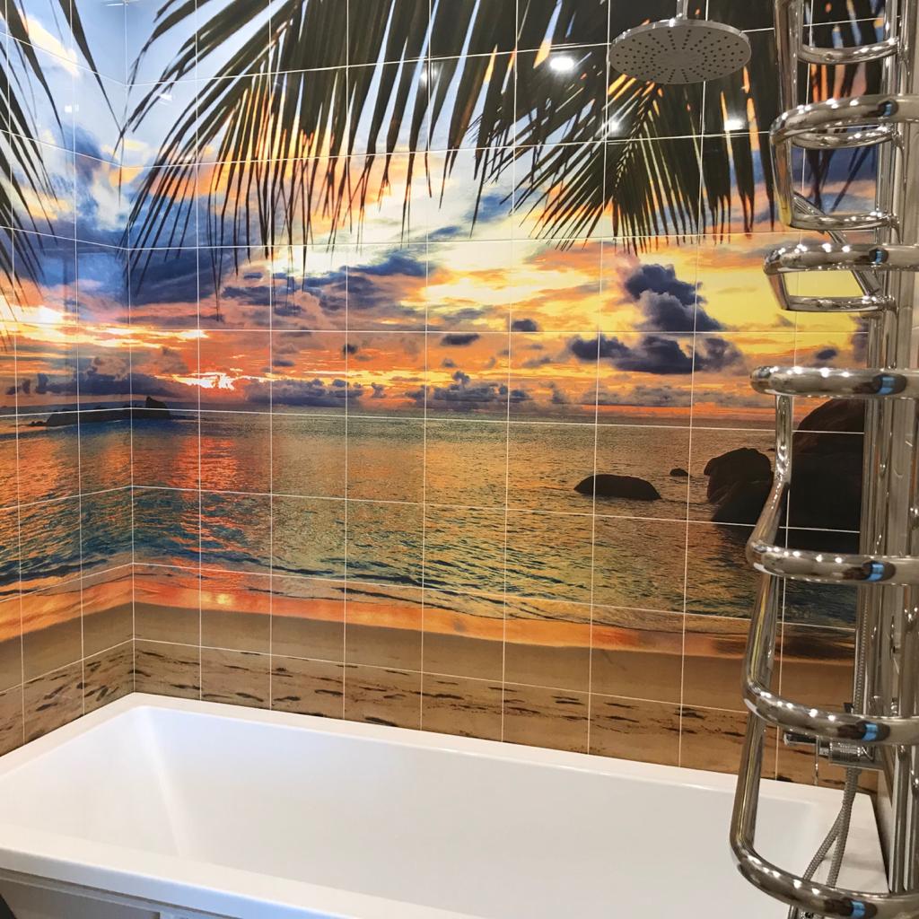 Фотоплитка ждала своего часа года 2, и в этом году мы ее положили. Эффект превзошёл наши ожидания! Панно очень стильно вписалось в задуманный интерьер.